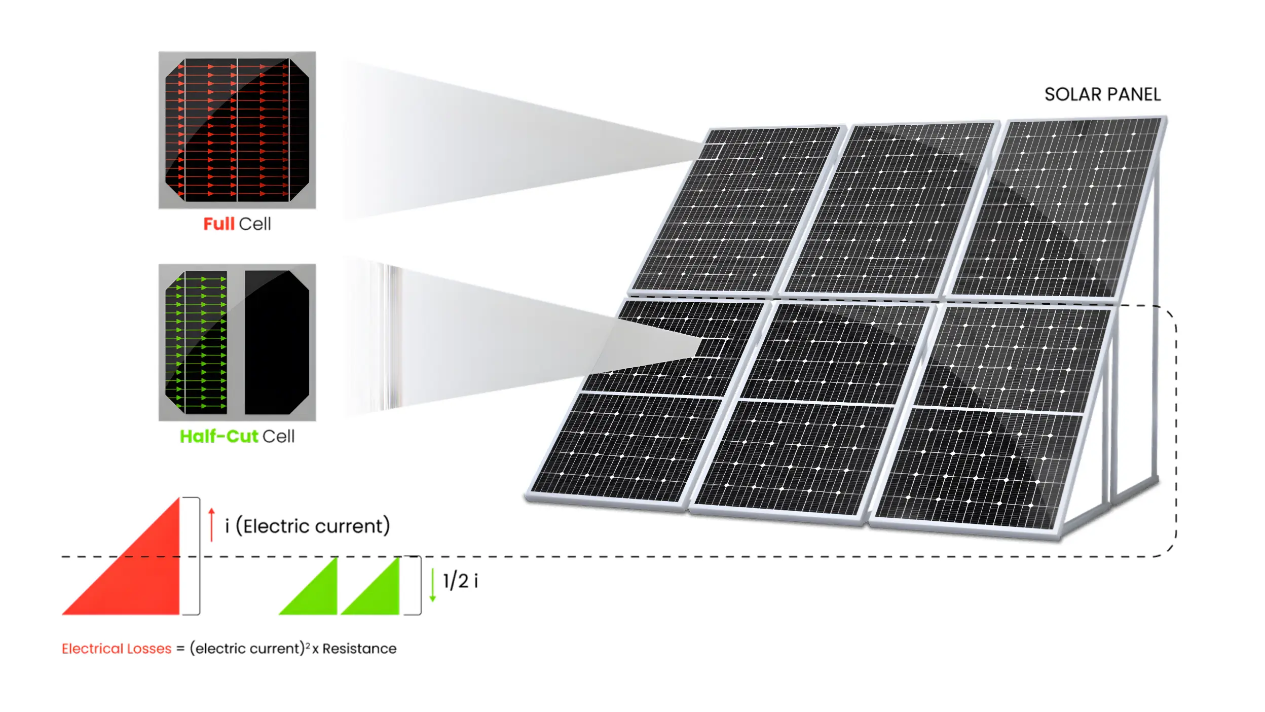 Half-cut cells reduce current per path, minimizing electrical resistance and improving overall system efficiency.